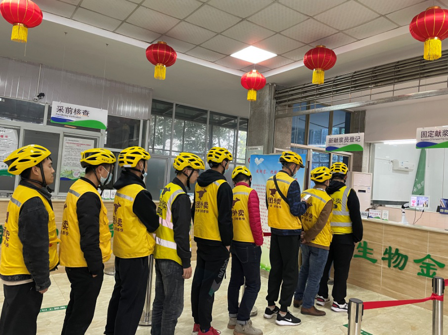 陽春三月,草長鶯飛,中國生物金堂血漿站迎來了20余位身穿亮黃工作服的美團外賣騎手,他們此行的目的不是來送餐,而是來捐獻血漿,為他人的生命加油助力。