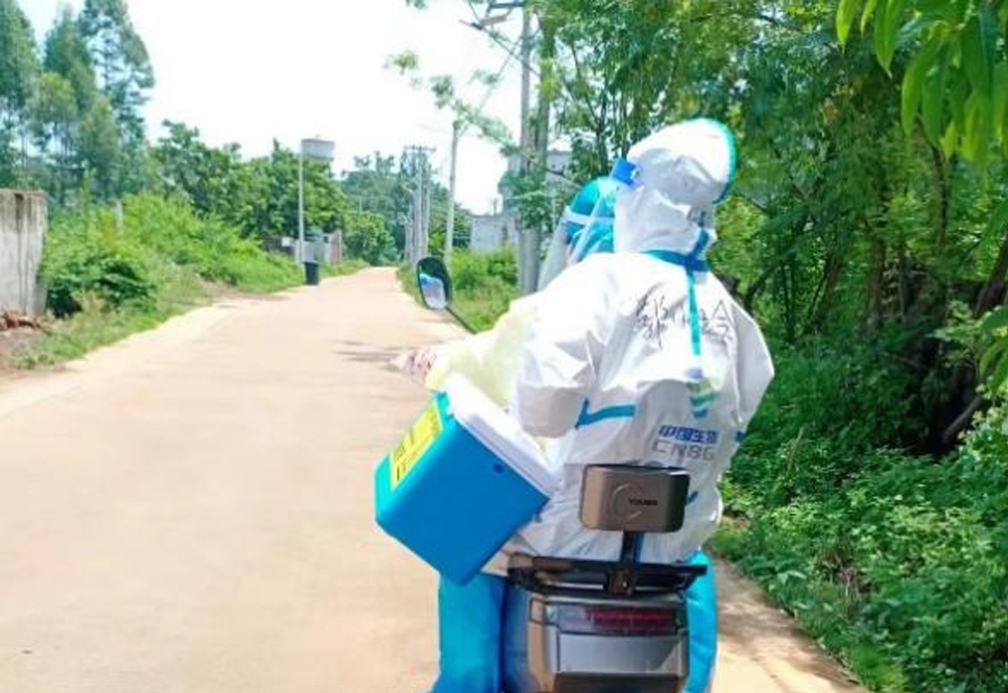 為了保證核酸檢測全覆蓋,臨高漿站承擔(dān)了上門采樣的工作。漿站工作人員騎著摩托車、拎著箱子,為村里一些行動(dòng)不便的居民提供檢測服務(wù)。截至8月14日,臨高漿站先后派出22人赴16個(gè)核酸采樣點(diǎn),采集樣本22851人份,入戶采樣768戶。38度高溫、密不透氣的防護(hù)服、12個(gè)小時(shí)室外高強(qiáng)度的采樣工作,是對工作人員技術(shù)、體力、耐心的全面考驗(yàn),脫下防護(hù)服的那一刻,他們的衣衫濕得能擰出水來。