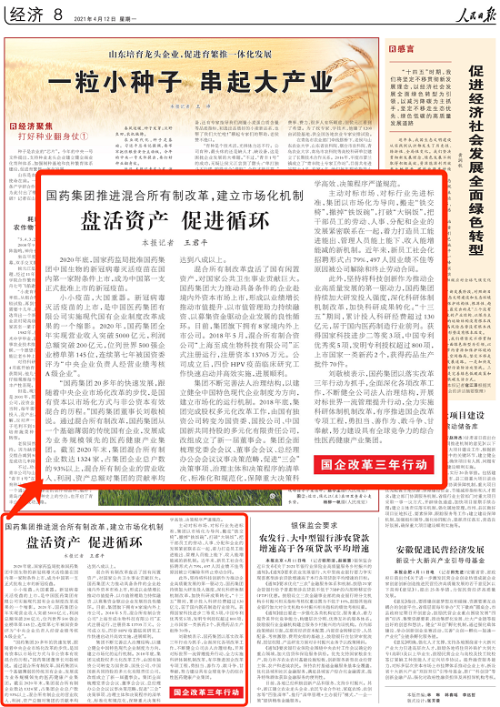 小小疫苗,大國重器。新冠病毒滅活疫苗的上市,是中國醫(yī)藥集團有限公司實施現(xiàn)代國有企業(yè)制度改革成果的一個縮影。2020年,國藥集團全年實現(xiàn)營業(yè)收入突破5000億元,利潤總額突破200億元,位列世界500強企業(yè)榜單第145位,連續(xù)第七年被國資委評為“中央企業(yè)負責(zé)人經(jīng)營業(yè)績考核A級企業(yè)”。